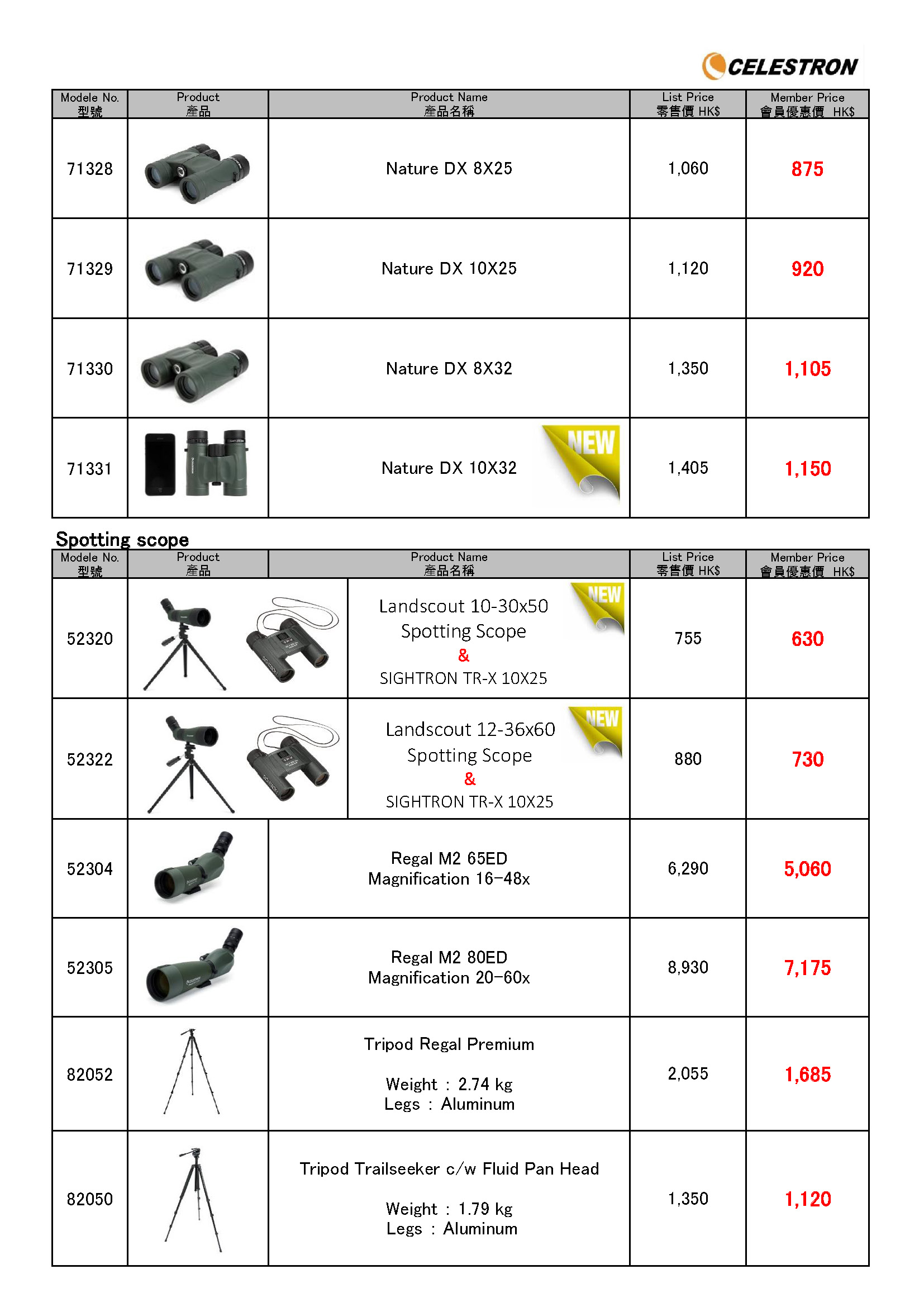本會辦事處有以下型號樣品供試用: The following demo units are available for trail in our office: SIGHTRON - SIIBL 8x32 - SIIBL 10x32 - SIIBL 10x42 CELESTRON - TRAILSEEKER 8x42 - NATURE DX 8x25 - REGAL M2 65ED SPOTTING SCOPE - LANDSCOUT 50MM SPOTTING SCOPE - LANDSCOUT 60MM SPOTTING SCOPE