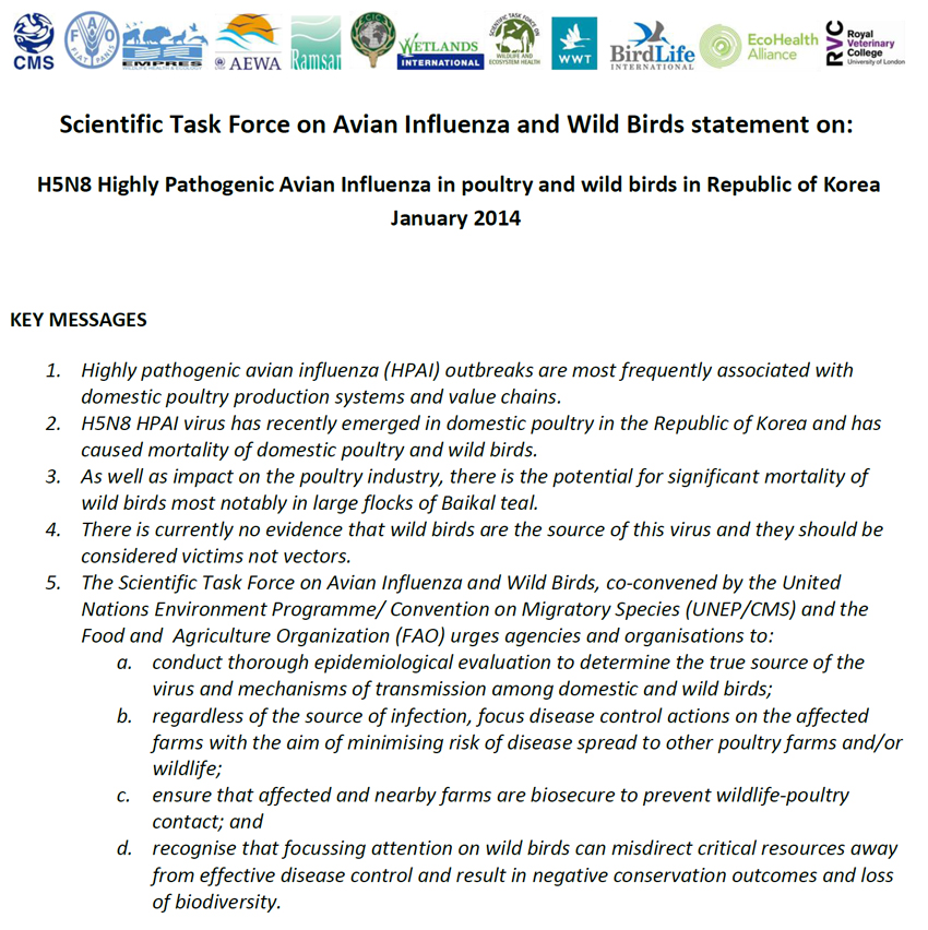 禽流感與野鳥國際科學特別工作小組於2014年1月對「韓國家禽養殖場及野鳥發生H5N8高致病性禽流感」所發出的聲明