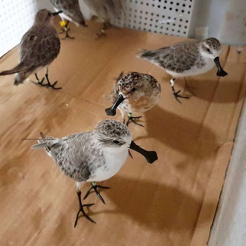 團隊另一半時間在泥灘上觀察涉禽並找尋勺嘴鷸,比對戴有足旗與沒有足旗的個體數,當未來數月團隊完成在飛行航道上其他地點的調查後,這些數據將助科學家以推算出最新的全球數量。團隊觀察涉禽群時找到戴有白旗4H的勺嘴鷸, 那隻鳥是團隊今年夏季在俄羅斯人工孵化的幼鳥, 實在令人鼓舞! 同時, 團隊也觀察到幾隻過往數年人工孵化的個體, 包括在一個晚上捕獲的6隻勺嘴鷸當中的白旗3K。