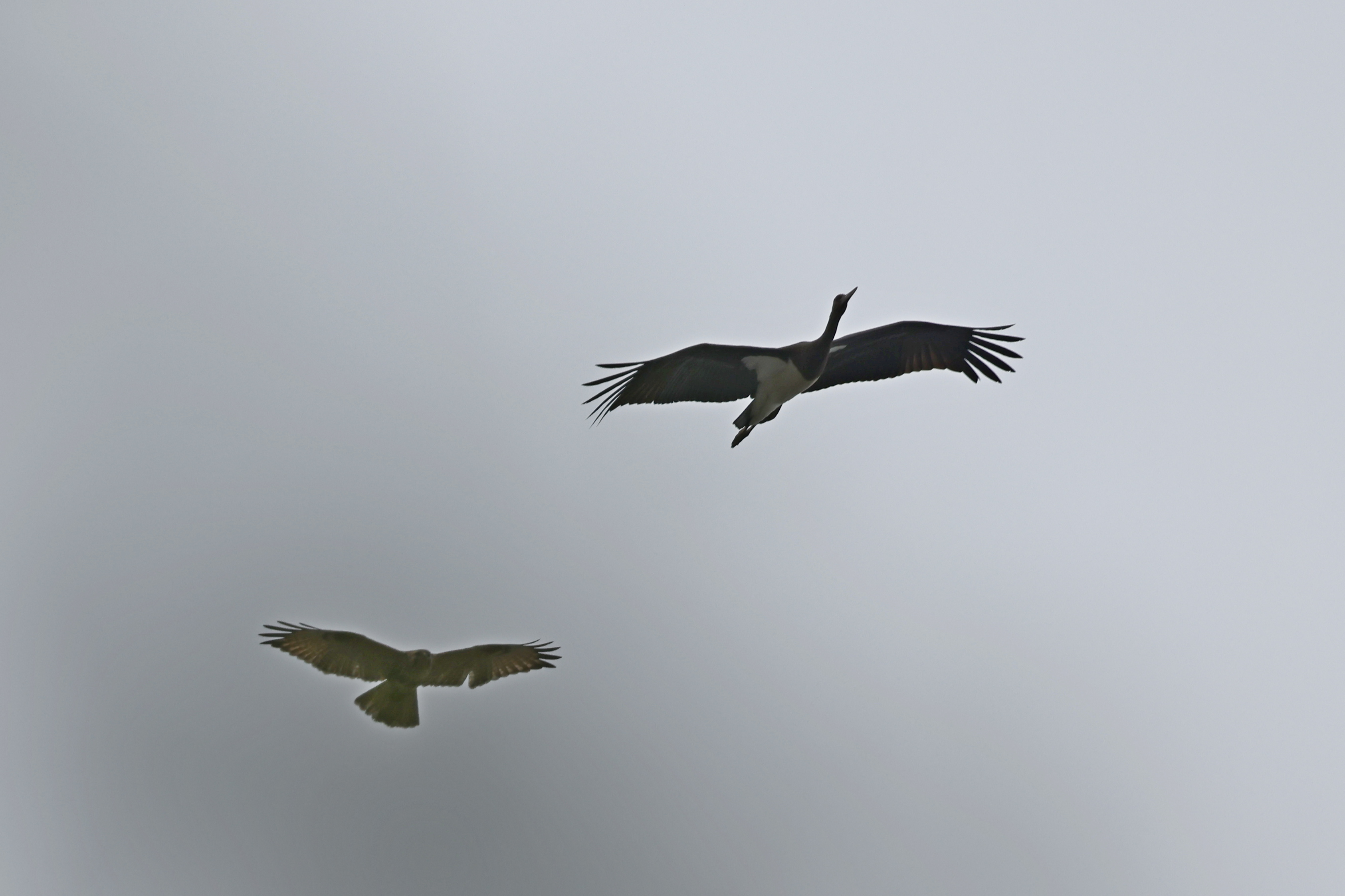 I took the photo at Ho Man Tin on 4 Dec. These two birds flied very high but slow. I thought the higher one was grey heron on first sight but looked different. Is it a black stork?