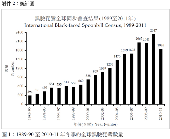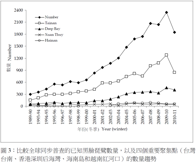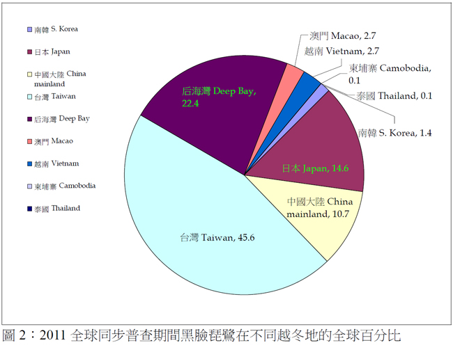 • 最大的越冬群仍是在台灣,總數目為843隻,佔全部黑臉琵鷺的46%,台灣是錄得最大跌幅的地區,比2010年少了437隻;