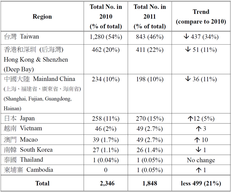         Mainland Chinese coastal areas fell by 15%.  Only 198 were recorded in 2011, decreased by 36 from last year’s total of 234.