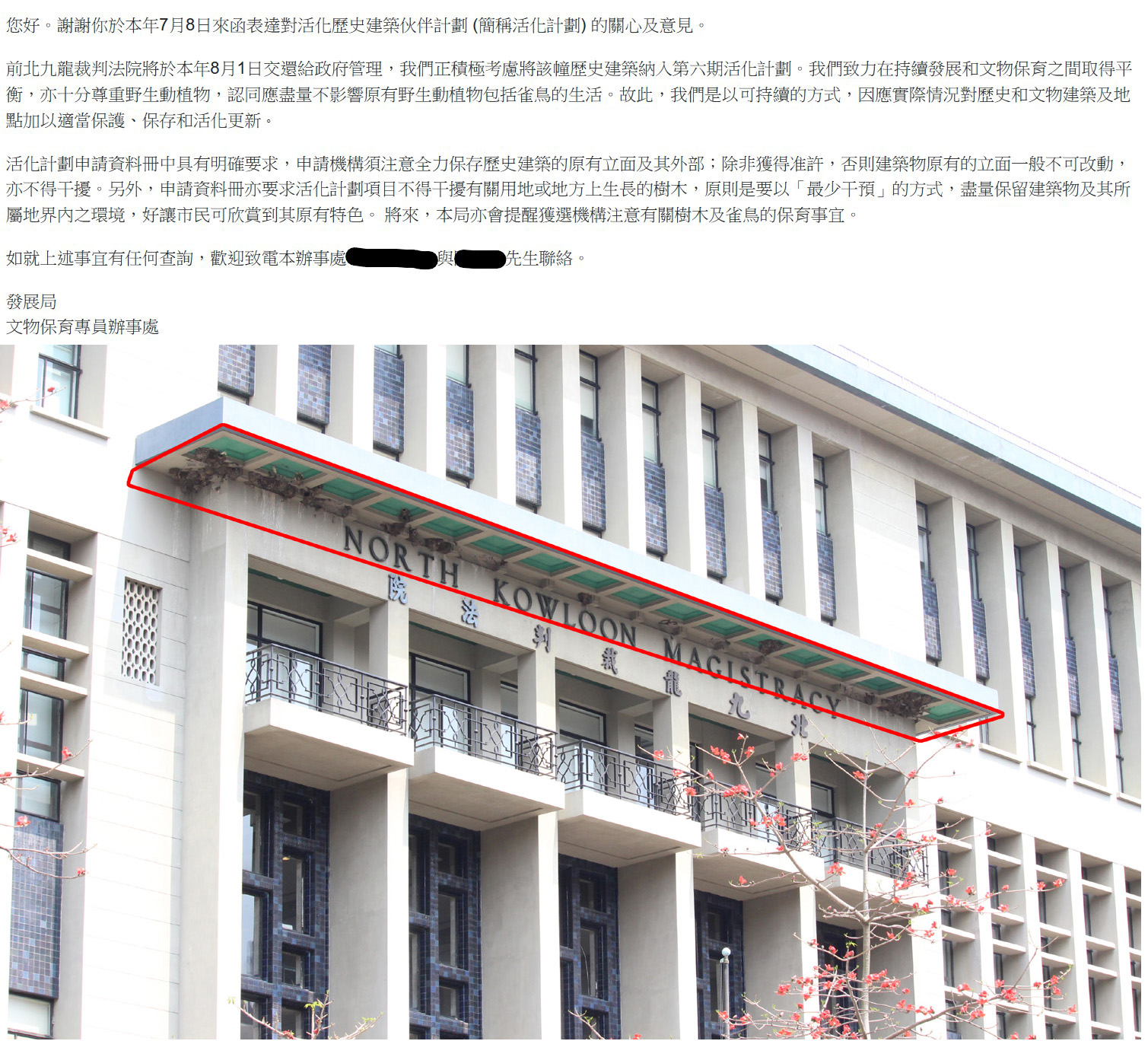 我們已就你的關注,轉交北九龍裁判法院活化工程的負責機構。據獲選機構的回覆,該機構已與漁護署聯絡。漁護署建議為免影響燕子的繁殖期,燕巢附近的工程不應於每年四月至九月進行。北九龍裁判法院活化項目的獲選機構於今年四月至九月期間,並沒有在燕巢附近進行工程。至於明年四月至九月,獲選機構將需在燕巢附近進行小型外牆維修及油漆潤飾,但此舉並不會對燕巢構成影響。此外,獲選機構已替燕巢拍下照片作記錄,並製作了燕巢的位置圖,漁護署對這些保護燕巢的措施表示滿意。
