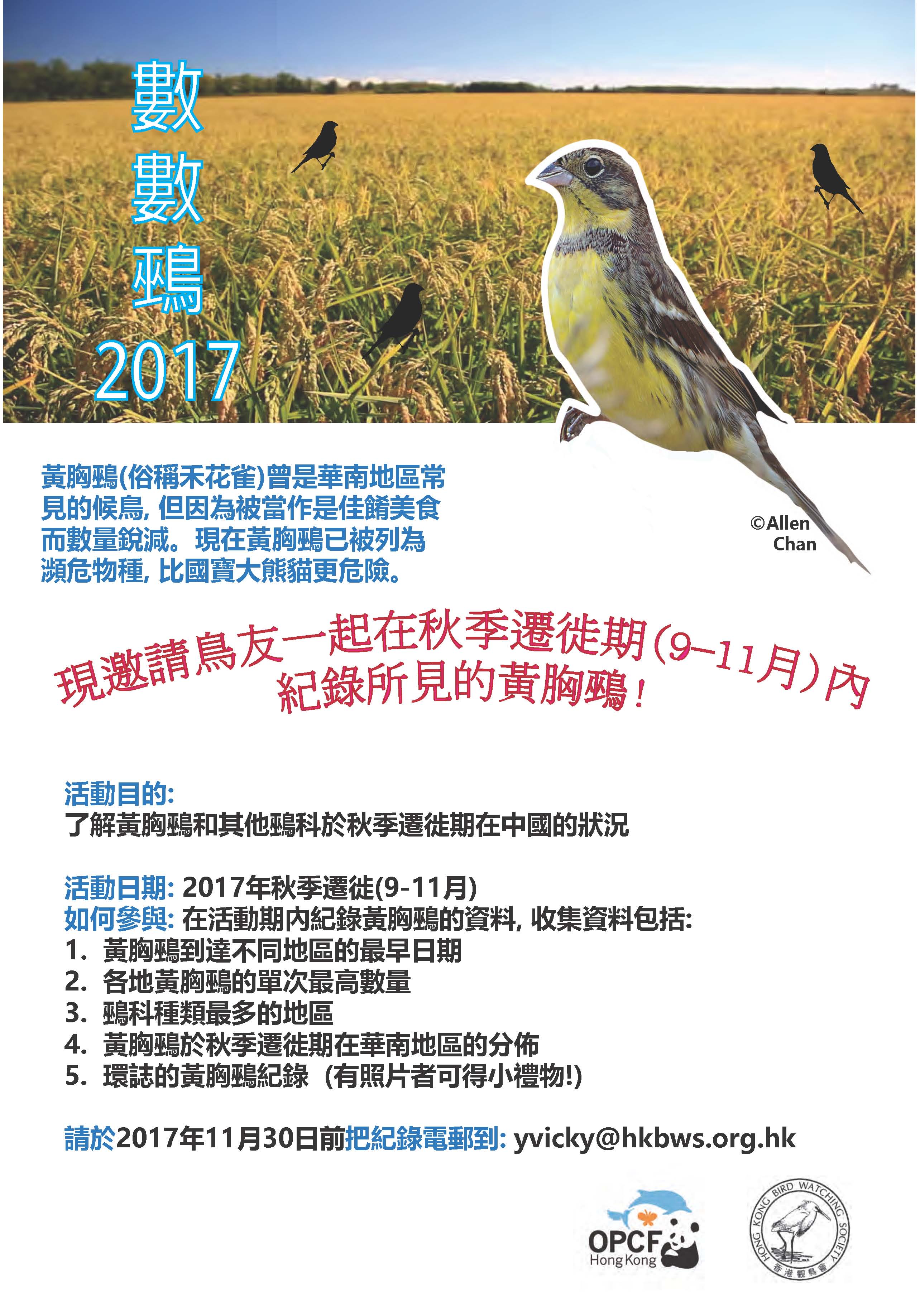 Let's support the conservation of Yellow-breasted Bunting and send your bunting records to yvicky@hkbws.org.hk by 30 Nov 2017!