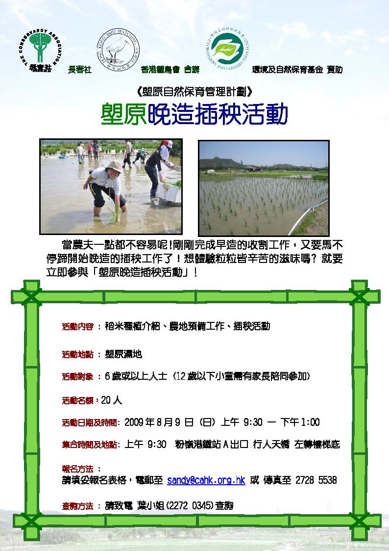 7月稻米收成的農地已經重新翻土整地,預備好作第二輪的稻米種植,我們誠邀各會員和朋友參加星期日(8月9日)的插秧活動,詳情如下:
