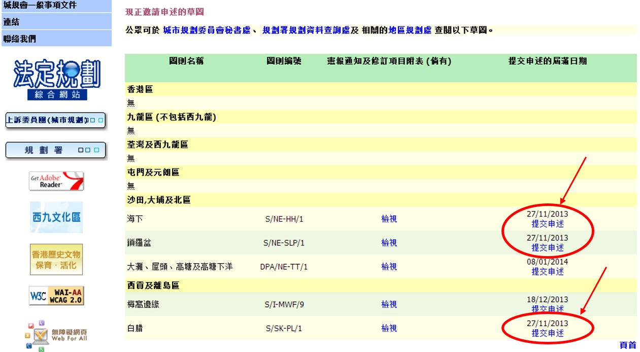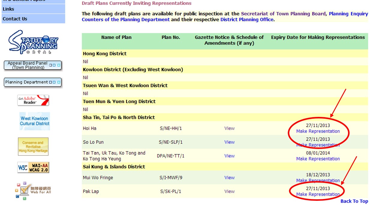 是次邀請意見的截止期限為2013年11月27日。香港觀鳥會就這三幅草圖內大面積的鄉村地帶所帶來的影響表示關注。在2010-2011施政報告中,政府承諾保護這些不包括土地的自然景觀,但這些分區劃大綱草圖反映出政府並沒有兌現承諾。我們相信應該把這些不包括土地納入它們附近的郊野公園範圍內。