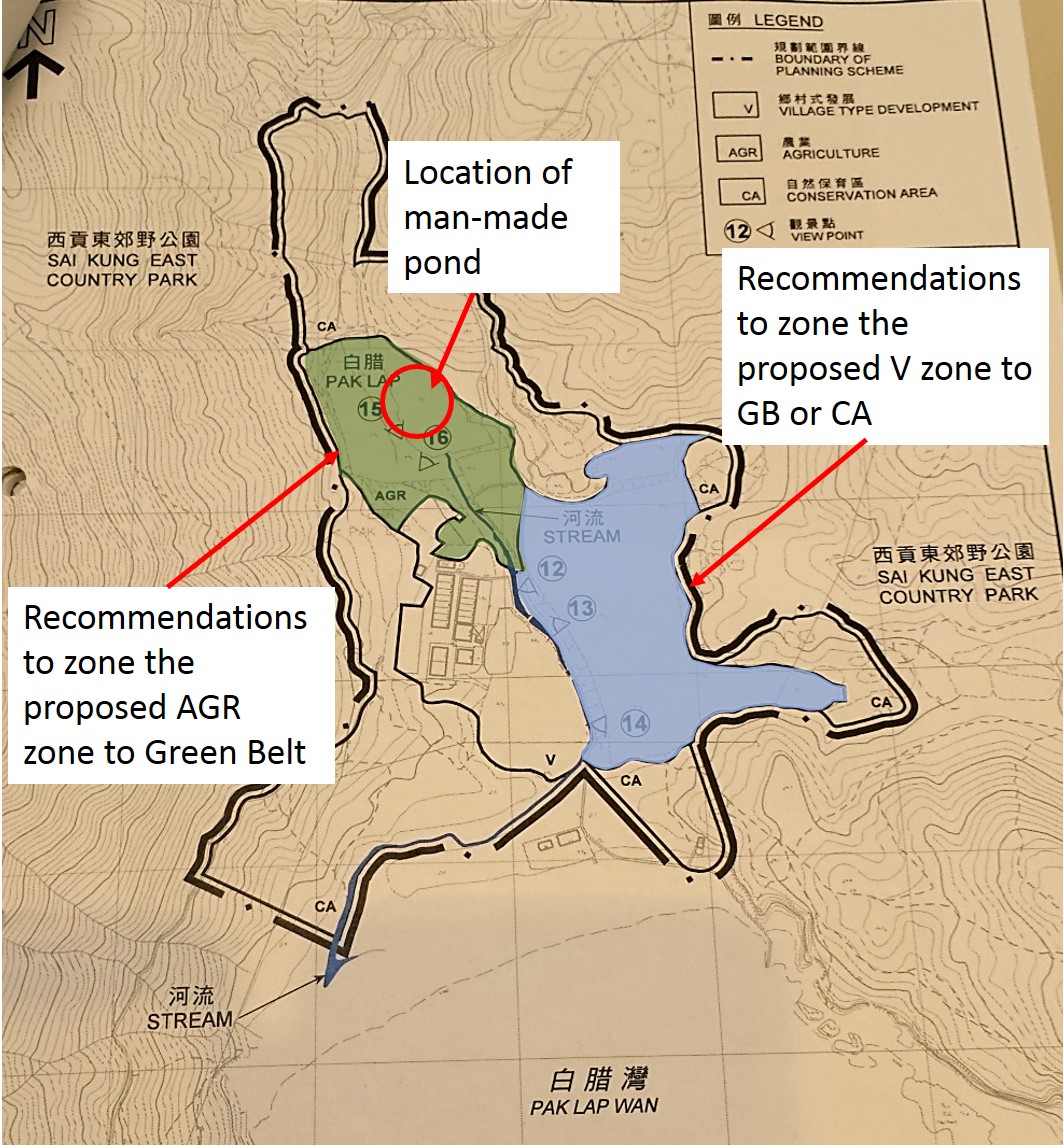 The proposed Agriculture (AGR) zone is located in an area of young plantation species and man-made pond.  This area is hydrologically linked to the stream which drains into Pak Lap Wan.  Surface runoff from farming activities would result in the increase of organic content in the stream and Pak Lap Wan.  We believe this area should be zoned as Green Belt (GB) to prevent water quality issues and also because the GB zoning would create a suitable buffer area of appropriate size between the existing village houses and the proposed CA.
