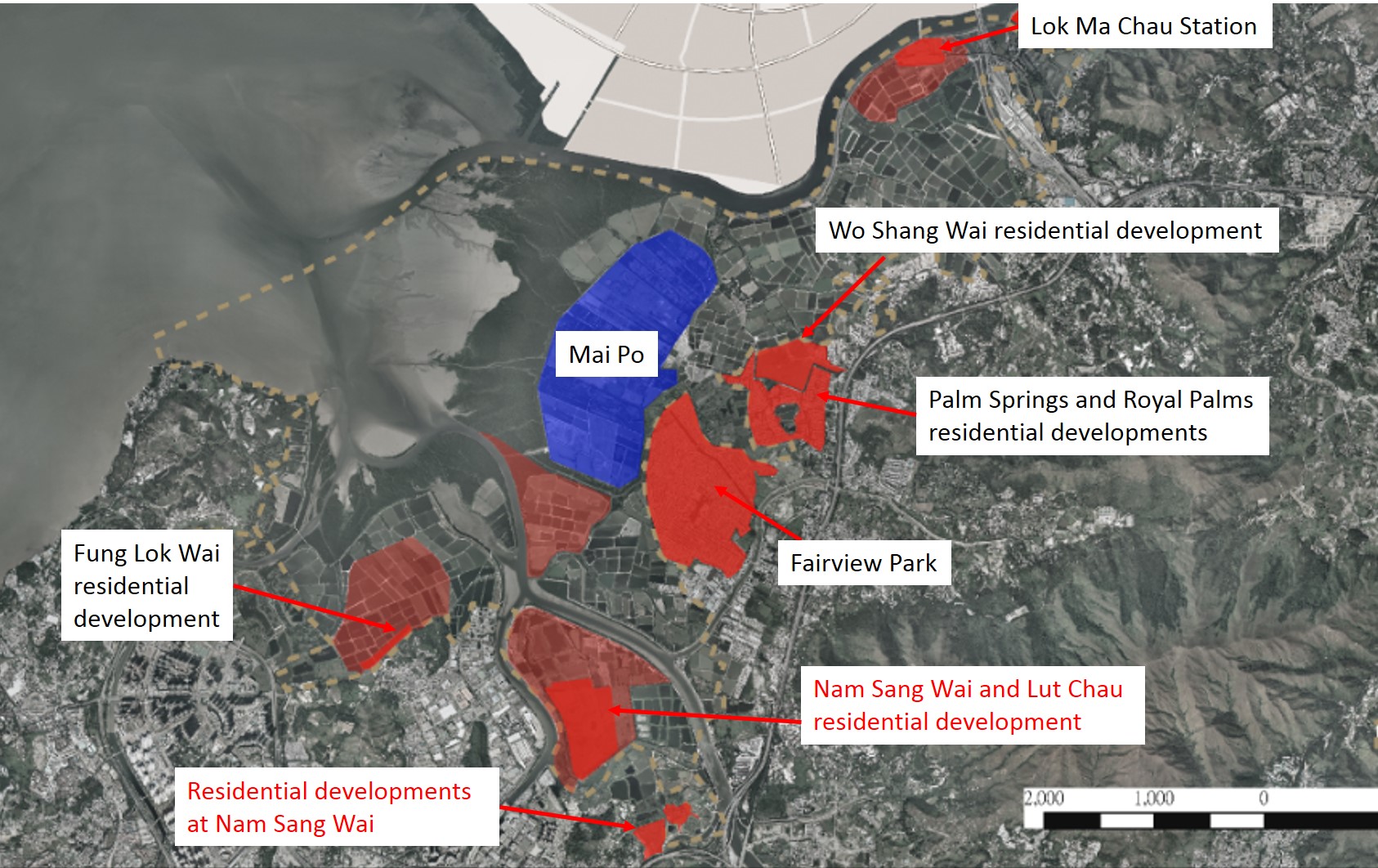 The Lok Ma Chau railway Station, Wo Shang Wai residential development, Palm Springs, Royal Palms and Fairview garden have already resulted in a loss of wetland habitats in the Northwest New Territories. Recently, the Fung Lok Wai residential development was also approved by the government.