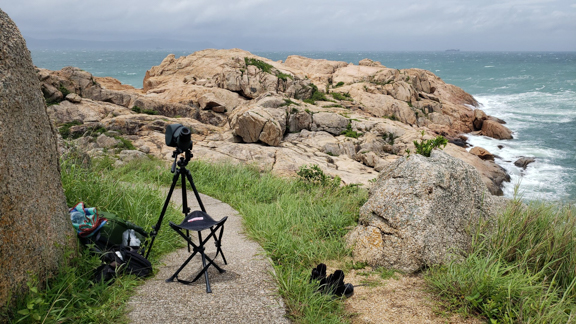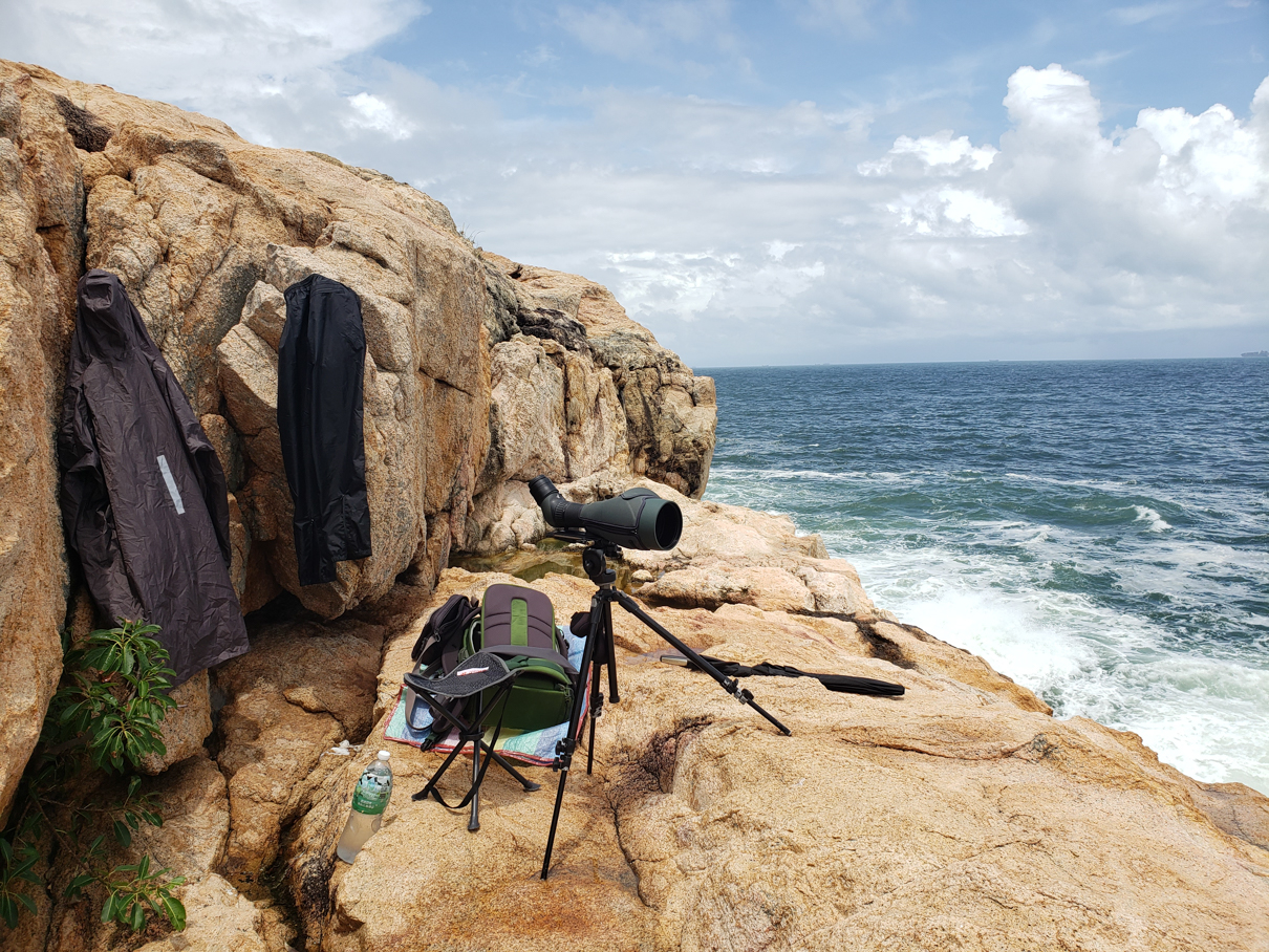 Is it perfect? No, it’s not. But during a typhoon, you’ll always have to give in on something. You indeed lose about 100 m. to the southeast and almost 200 m. to the southwest. And a part of the rocks obstructs the view. But there is a very large gap to the left of that, where you can see the Lema Channel. And to the right, you can view all of the Hong Kong southern waters. The height is very good. Your tripod and scope are stable. And it’s very safe. Only if winds would turn to the south, you can’t avoid them, unless you give up views of the Lema Channel. (Note: when winds decreased to force 6, coming from the south, I headed back to the rocks and sat on the northwest side, where I could hide from direct winds and waves. I had to regularly bear very fine salt sprays, though.)