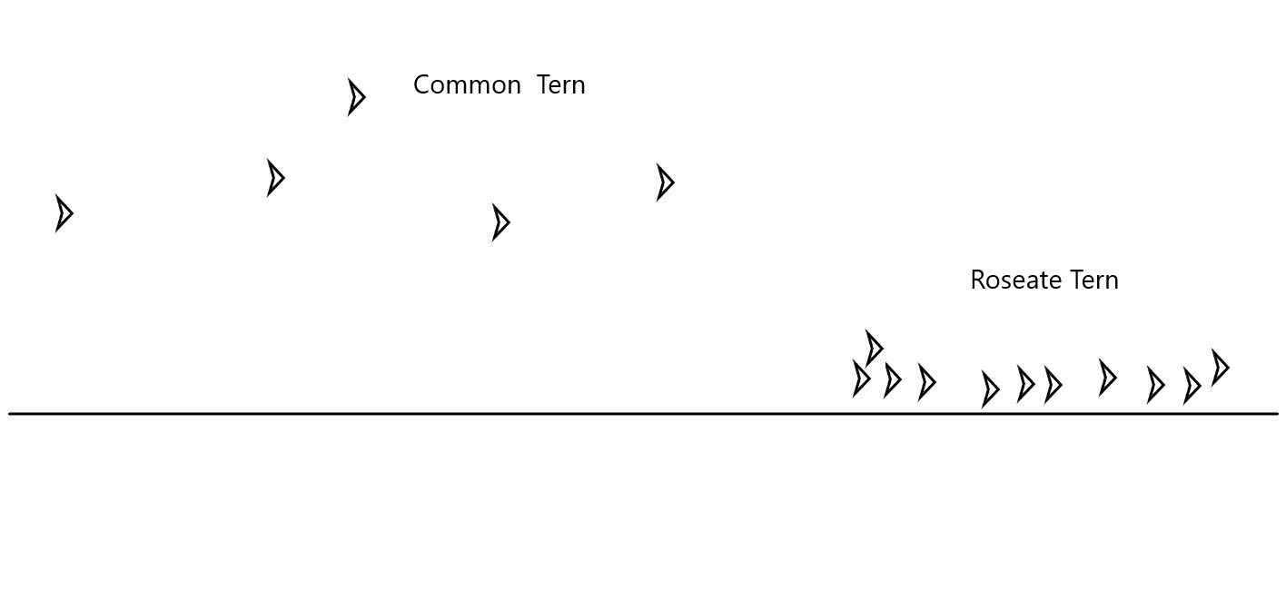 I did notice, same as last autumn, that there is an obvious difference of the flight behaviour of migrating Common Terns and Roseate Terns. Remember that we’re not talking about close-by birds, but migrants at 1 to (mostly) 2 km out, and some even further, which makes identification often hard, especially in bad light. Yet, when they are not too far and lighting is good, plumage differences are seen, which makes ID-ing plausible and this experience then helps in ID-ing some of the more distance ones as well. Roseate Tern is a much whiter bird than Common, but Gull-billed Tern and Black-naped are the whitest terns. Roseate is structurally more elegant and elongated than Common. But I additionally found that the way they form groups is very different. Below is an illustration of what I mean: Common Terns pass-by in loose groups, with mostly some distance between individuals, flying substantially above the water. Roseate Terns fly low, close to the water (the horizontal line on the illustration) and they form a line formation, meaning mostly one after the other.