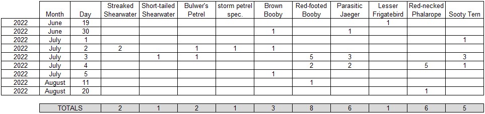 This is an overview of all (migrating, except for the Lesser Frigatebird) seabirds and all (migrating) terns and gulls seen during the summer (i.e. June, July and August) of 2022. Below are the totals for the whole season.