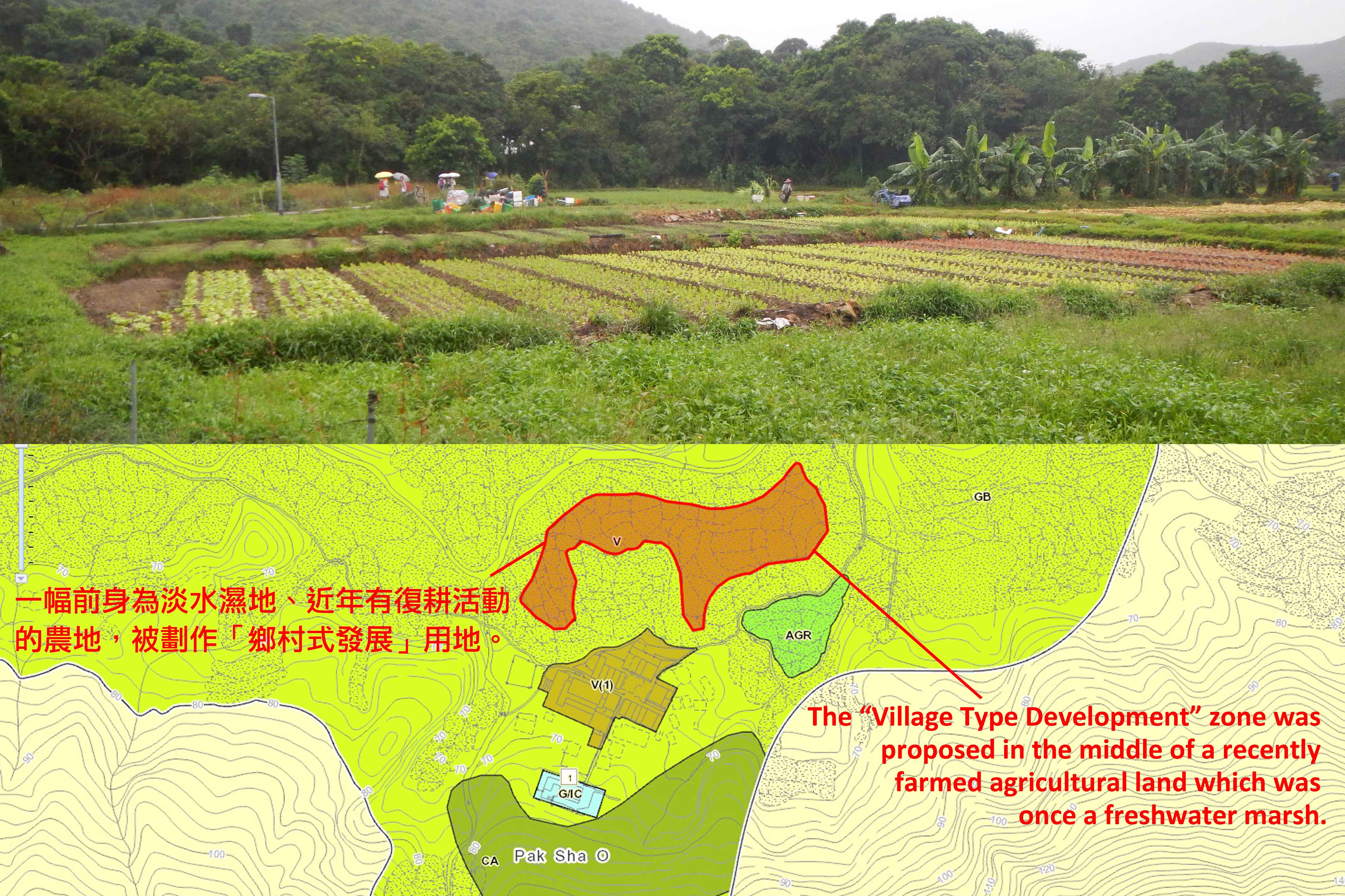 • A “Village Type Development” (V) zone of 0.7 hectare was proposed in the middle of a recently farmed agricultural land, which was once a freshwater marsh. The V zone is right inside the water gathering ground and is only 20 metres from the Ecologically Important Stream (EIS) in Pak Sha O. Development in the V zone may lead to water pollution and increase the flooding risk in this ecologically sensitive area of Pak Sha O.
