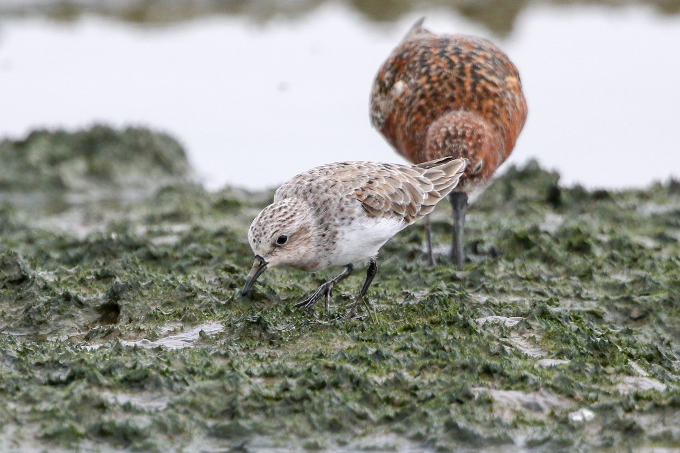 Red-necked Stint in front of a Curlew Sandpiper in full breeding plumage, I think.
