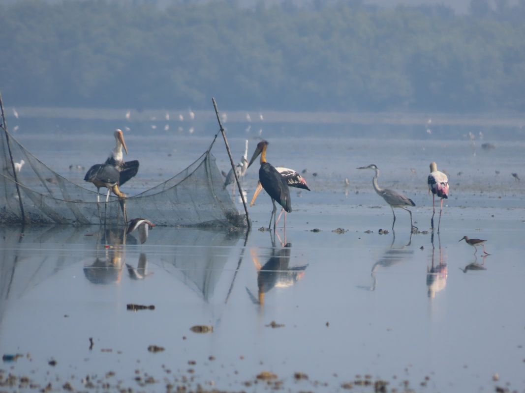 Lesser Adjutant and other waterbirds foraging close to fishing net
